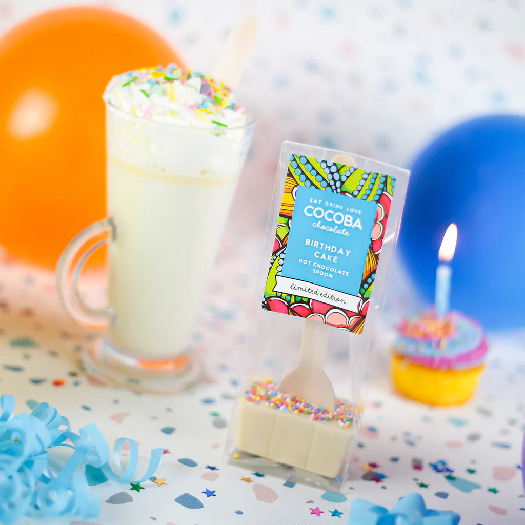 - Birthday Cake white chocolate hot chocolate spoon from Cocoba Chocolate