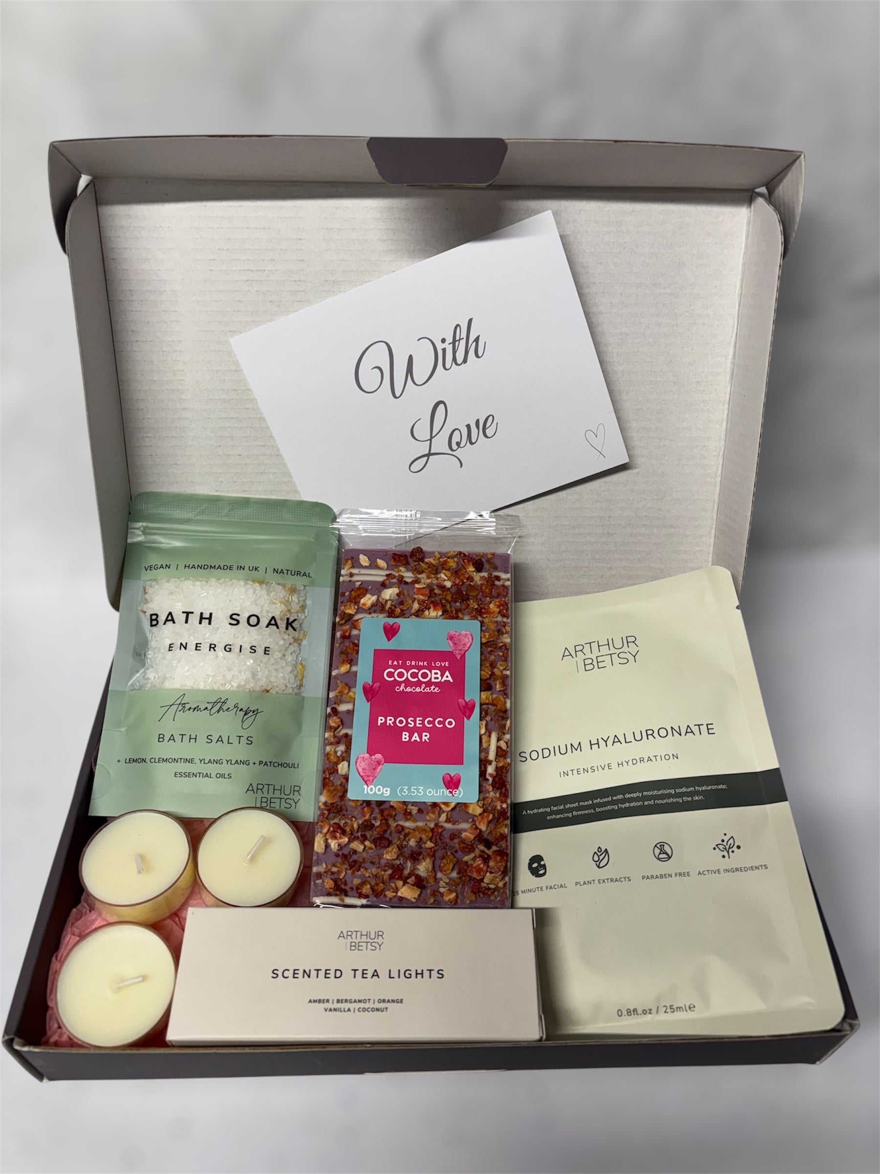 Our indulgent 'Prosecco & Pamper' gift box is a wonderful treat and suitable for any occasion. So whether it's a birthday, an anniversary, mother's day, a thank you or even a good luck gift this one is certainly sure to delight. You can personalise it further with the 'With Love' notecard.