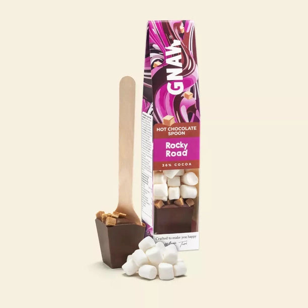 - GNAW rocky road hot chocolate spoon 40g. Topped with fudge pieces and marshmallows. Contains 36% Columbian cocoa.