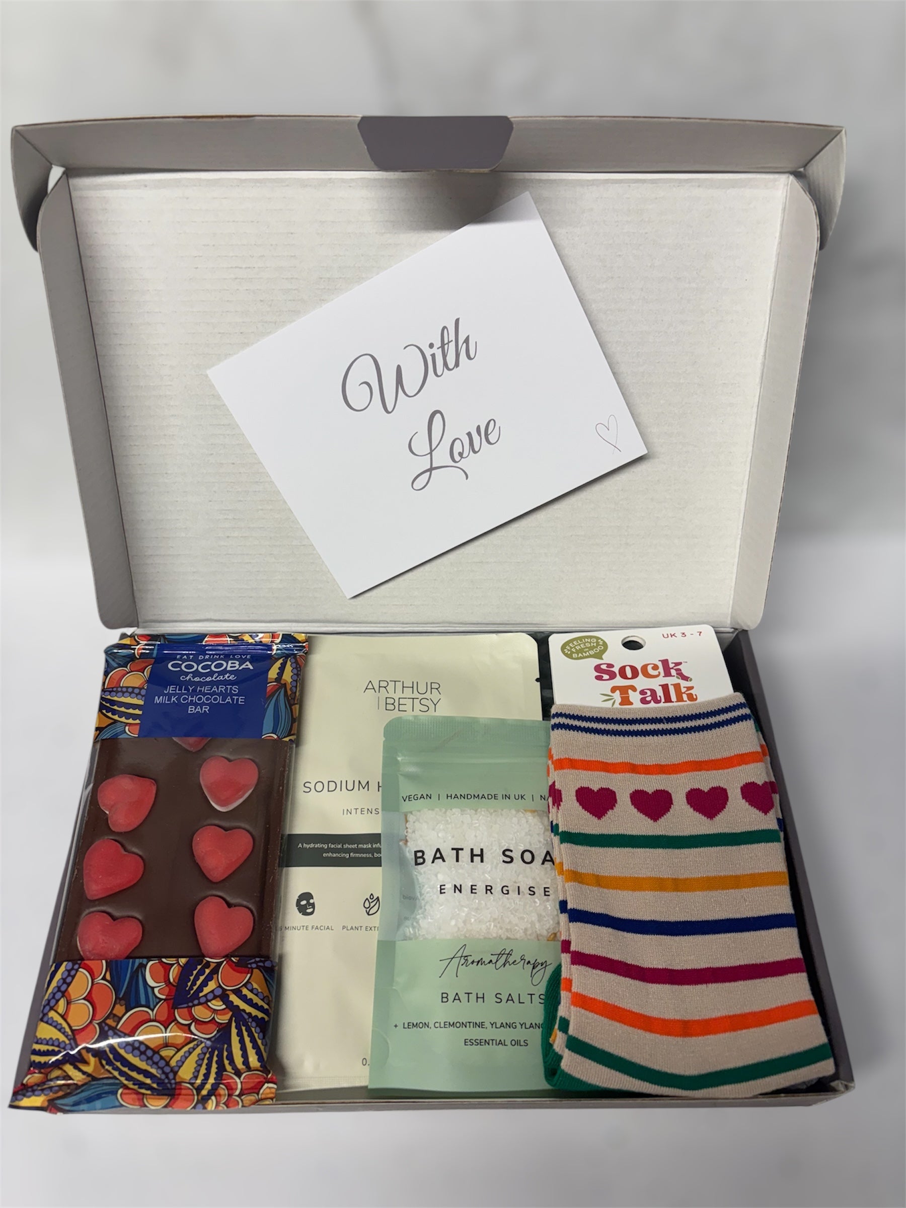 A gorgeous gift box full of lots of pampering treats so send to someone special. Our 'With Love' gift box is suitable for any occasion, a birthday, an anniversary, mother's day, a thank you or even a good luck gift. You can personalise it further with the 'With Love' notecard.